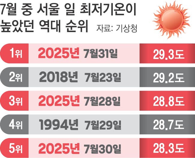 2. 여름 끝나기도 전에 벌써 불더위 신기록 연속 → 6, 7월 전국 평균 30.1도, 30일 서울의 최저기온 29.3도, 서울 열대야 일수(22일)도 117년간 기상 관측 이래 최고, 최장... 이 기록은 계속 경신 중.(경향 외)
