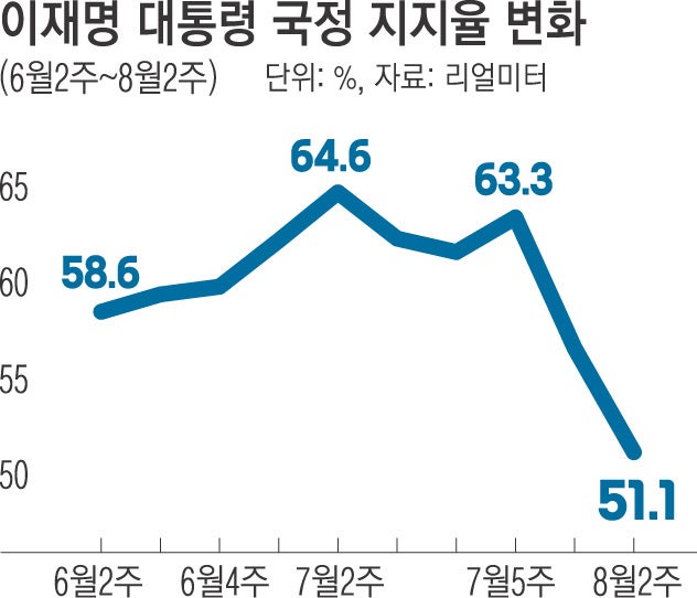 → 대통령 지지도 최근(8월 둘째 주) '51.1%'로 급락. 취임 후 최저.