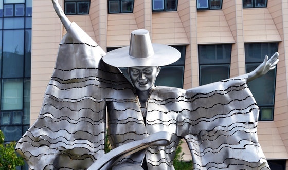 → 이 조형물은 2014년 세종시 국세청사 앞에 설치됐던 것으로, 한복에 갓을 쓴 남성이 전통춤을 추는 모습을 표현했지만 당시 '저승사자 같다'는 지적에 철거.(중앙)