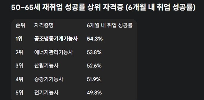 1. 50세~65세 재취업이 가장 잘 되는 자격증 → 6개월내 취업 성공률 1위 ▷공조냉동기계기능사(54.3%) 이어 에너지관리기능사(53.8%), 산림기능사(52.6%), 승강기기능사(51.9%), 전기기능사(49.8%) 순. 첫 취업에서 급여가 가장 많은 자격은 ‘타워크레인 기능사로 월369만원.(매경)